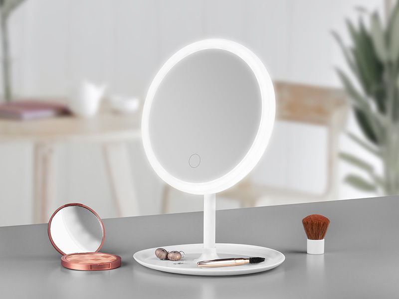 White light emitted by the LEDs make every color visible in the mirror highly realistic. The mirror base has a notch which can be used as a tray for small makeup products.